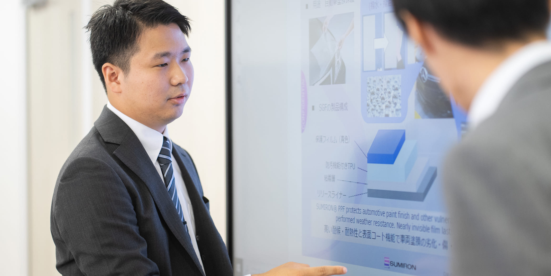 保護フィルムという製品の特性上、使用環境や条件に左右されやすく、細やかな要望に必ずしもすべて応えられないこともあります。その際は難しさを痛感しますが、一方で現場から吸い上げた課題を社内へ持ち帰り、開発や製造と協力して改良を重ねた結果、お客様に認められたときの達成感は格別です。こうして得られた信頼は、自分個人の成果ではなく、社内全体が一丸となって取り組んだ結果だと実感します。現場での要望を吸い上げ、社内の知見をつなぎ合わせて形にしていくことが、スミロンで営業として働く面白さですし、他にない価値だと感じています。